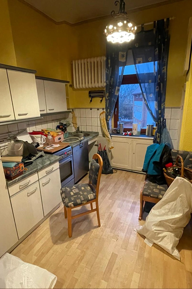 Die Küche zeigte noch den vollen Alltag der früheren Bewohner: weiße Einbauküche, Eckbank mit Polstern, Tisch, Geräte und viele Kleinteile auf den Arbeitsflächen.