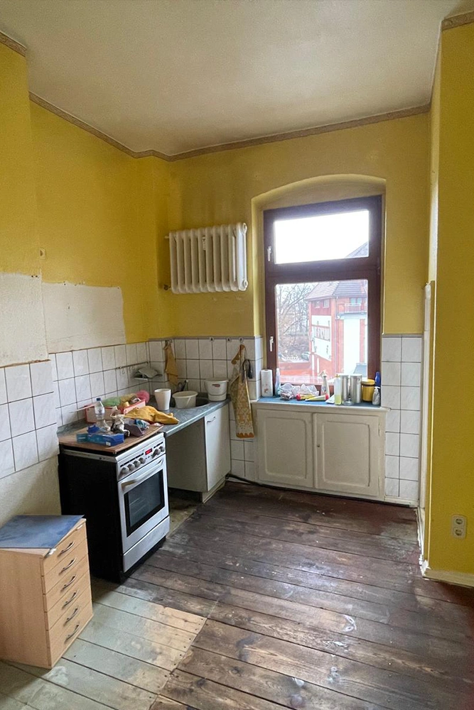 Am Ende blieb eine komplett freie Küche zurück – Wände mit sichtbarem Fliesenspiegel, der Boden gekehrt und bereit für eine neue Nutzung.