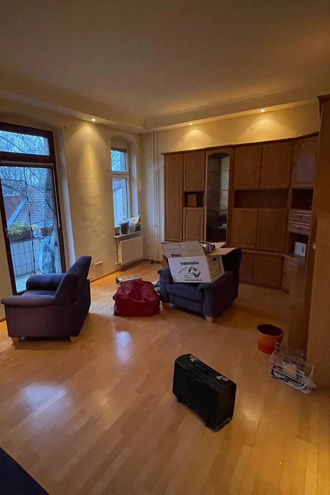 Im Wohnzimmer mit Balkonzugang stand noch eine große Wohnwand, mehrere Sessel, ein Sofa und diverses Kleinmobiliar. Durch die Fensterfront wirkte der Raum freundlich, war aber logistisch anspruchsvoll, weil viele große Teile bewegt werden mussten.