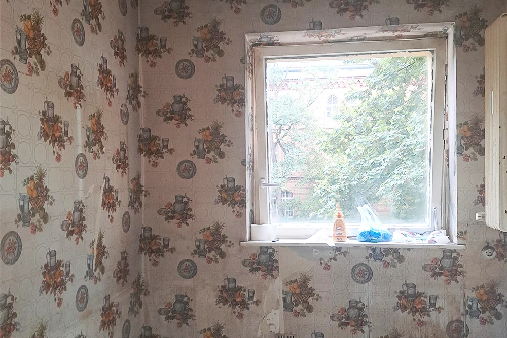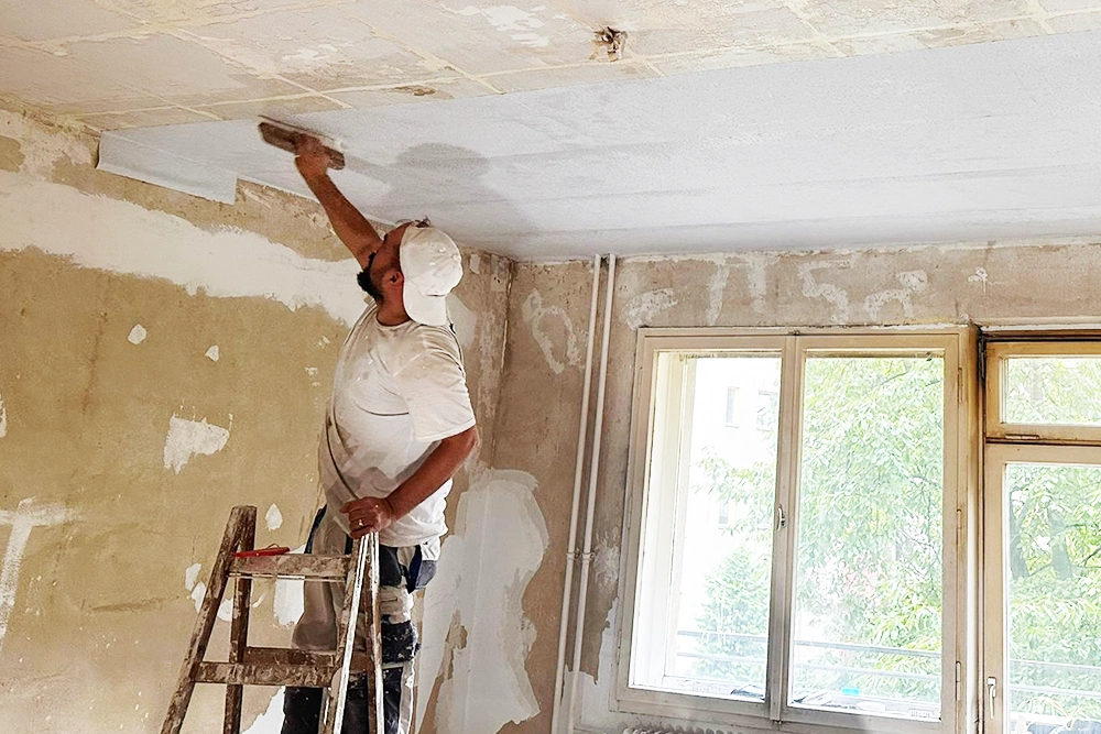 Nach der Wohnungsauflösung lag die Wohnung leer, aber baulich uneinheitlich vor: an den Wänden stellenweise fest sitzende Alt­tapeten, punktuell abgeplatzte Spachtelstellen, unterschiedliche Saugfähigkeit und eine Decke mit alten Kleberastern und ausgerissenen Bereichen.