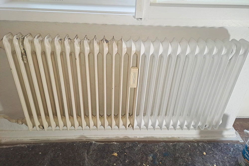 Die Heizkörper trugen mehrere gealterte Lackschichten mit Anhaftungen.