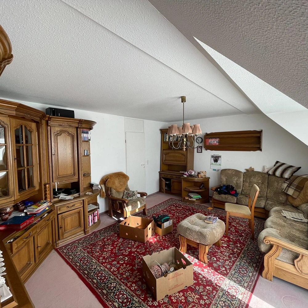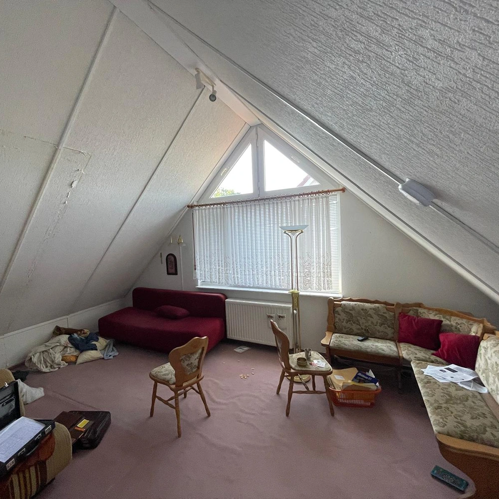 Der Hobbyraum im Dachgeschoss war ein typischer Mehrzweckraum: mehrere Sofas, Sitzgruppen, ein kleiner Tisch, Kisten mit Papieren, Handarbeiten, Fotoalben und allerhand „Kleinkram“, der sich über die Jahre angesammelt hatte. Wir begannen mit einer groben Vorsortierung: Papier, Restmüll, Elektronik, Textilien und Metall wurden getrennt, um eine fachgerechte Entsorgung zu gewährleisten. Brauchbare Gegenstände wurden für eine Weitergabe vorbereitet. Anschließend wurden Sofas, Eckbank und weitere Polstermöbel durch das enge Treppenhaus nach unten getragen. Weil der Teppich auch hier erhalten bleiben sollte, legten wir die Laufwege abermals mit Schutzmaterial aus. Zum Schluss wurde der Raum gefegt und der Teppich abgesaugt – der neue Eigentümer kann ihn jetzt ohne weiteren Aufwand übernehmen oder später in Ruhe austauschen.