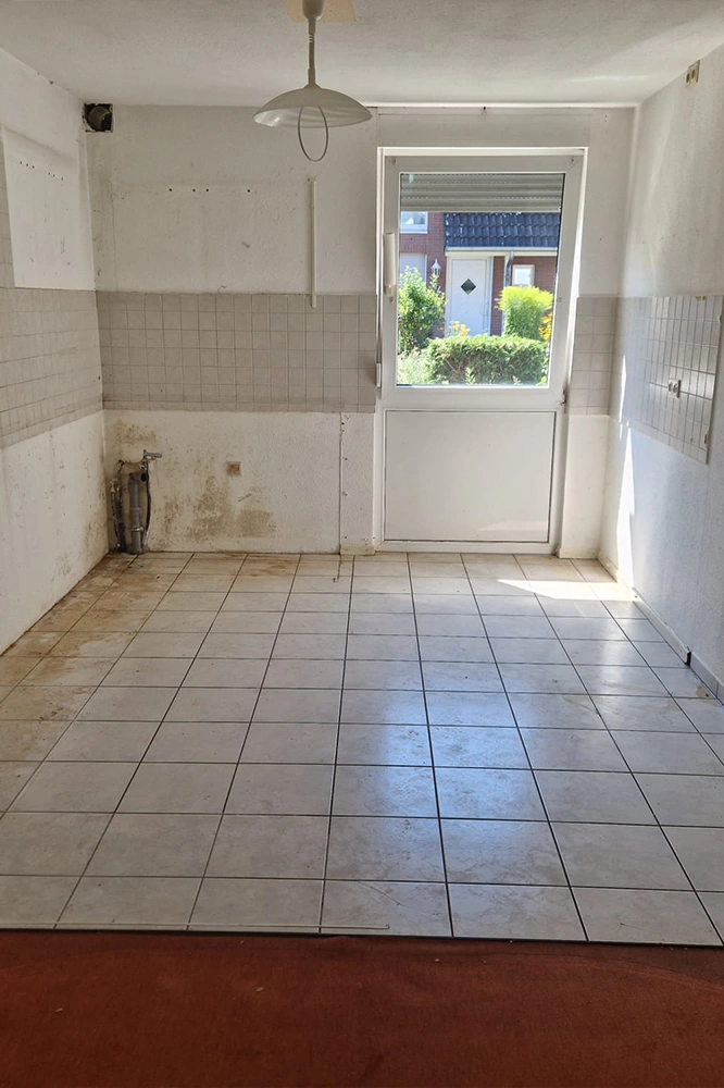 Zurück blieb ein leerer Raum mit freier Sicht auf Fliesenboden und Wände – ideal, um die Küche später neu zu planen oder die Fläche anderweitig zu nutzen.