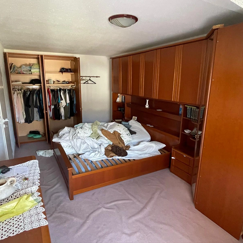 Im Schlafzimmer stand eine durchgehende Schrankwand mit integriertem Bett, Nachttischen und Kommoden – klassisches, schweres Mobiliar, das seit Jahrzehnten nicht bewegt worden war. Zusätzlich waren die Schränke bis oben hin mit Kleidung, Bettwäsche und persönlichen Dingen gefüllt.