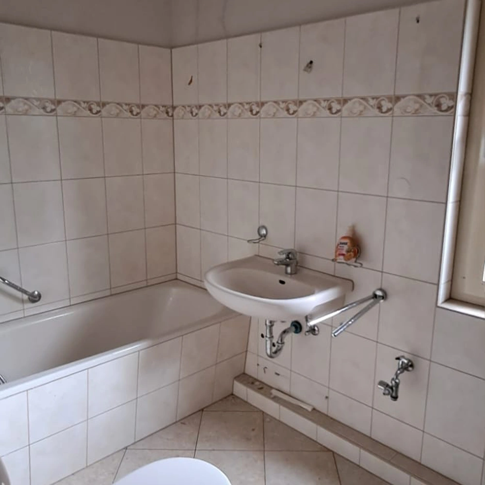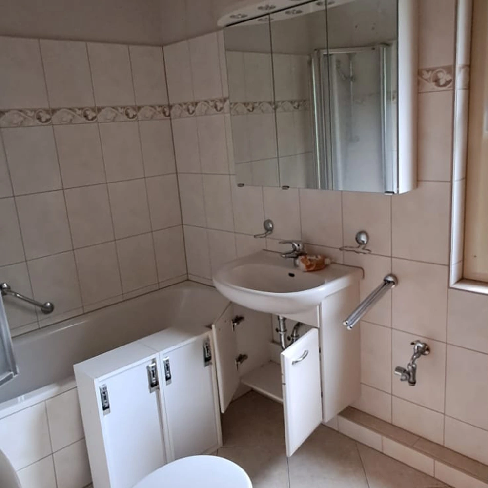 Im Bad sollten nur die Möbel weichen, nicht die Sanitärkeramik. Unser Auftrag umfasste deshalb die Demontage von Spiegelschrank, Unterschrank und weiteren Staumöbeln.
